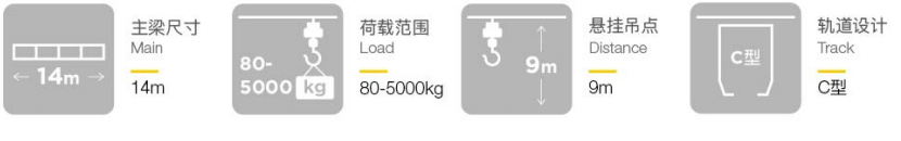 該產(chǎn)品為鋼質(zhì)結(jié)構(gòu),起重量在75kg-2000kg之間,主梁總長(zhǎng)可達(dá)14m(可選鋁制主梁);