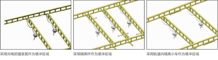 當需要有多個操作人員在同一區(qū)域同時工作時,可以采用多主梁起重機。我們通??梢圆捎枚喾N形式的緩沖區(qū)域防止起重機主梁之間相互干涉。通過這種方式也可以實現用小規(guī)格的型軌承載多個主梁。比如,用500公斤承載能力的型軌可以同時承載兩組500公斤承載的主梁。當然,為了防止型軌上的負載超載,我們需要采用緩沖區(qū)域保持主梁之間的間距。